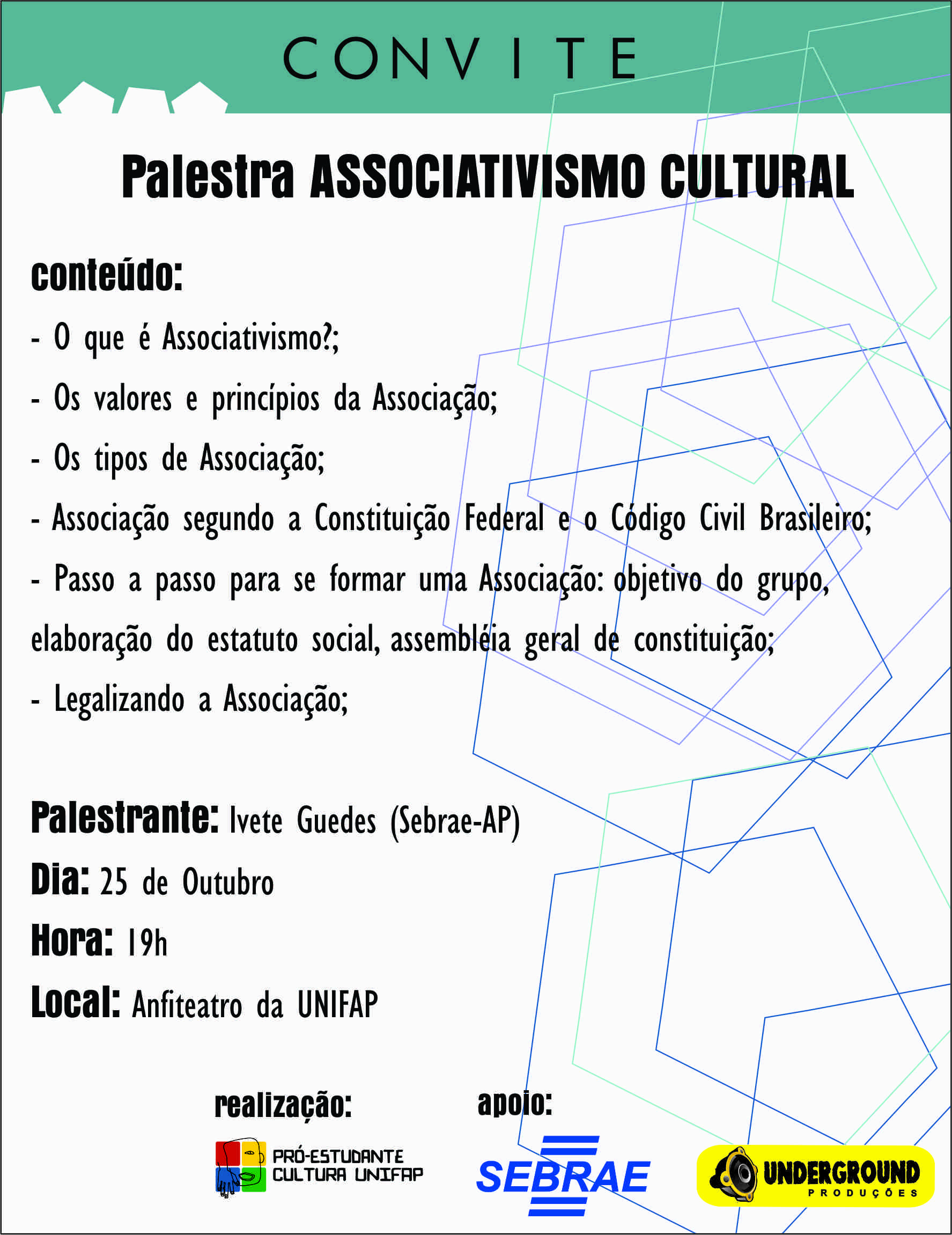 Tendo em vista a necessidade de organizarmos melhor as nossas frentes de trabalho mediante as instituições públicas e de fomento, o Pró-Estudante Cultura Unifap, em parceria com o SEBRAE-AP, esta fazendo o convite pra comunidade em geral para participarmos de uma palestra a respeito de Associativismo Cultural. É de suma importância a participação de entidades, músicos, artistas, produtores e profissionais da área cultural, sendo que a mesma também servirá para qualquer tipo de associação.