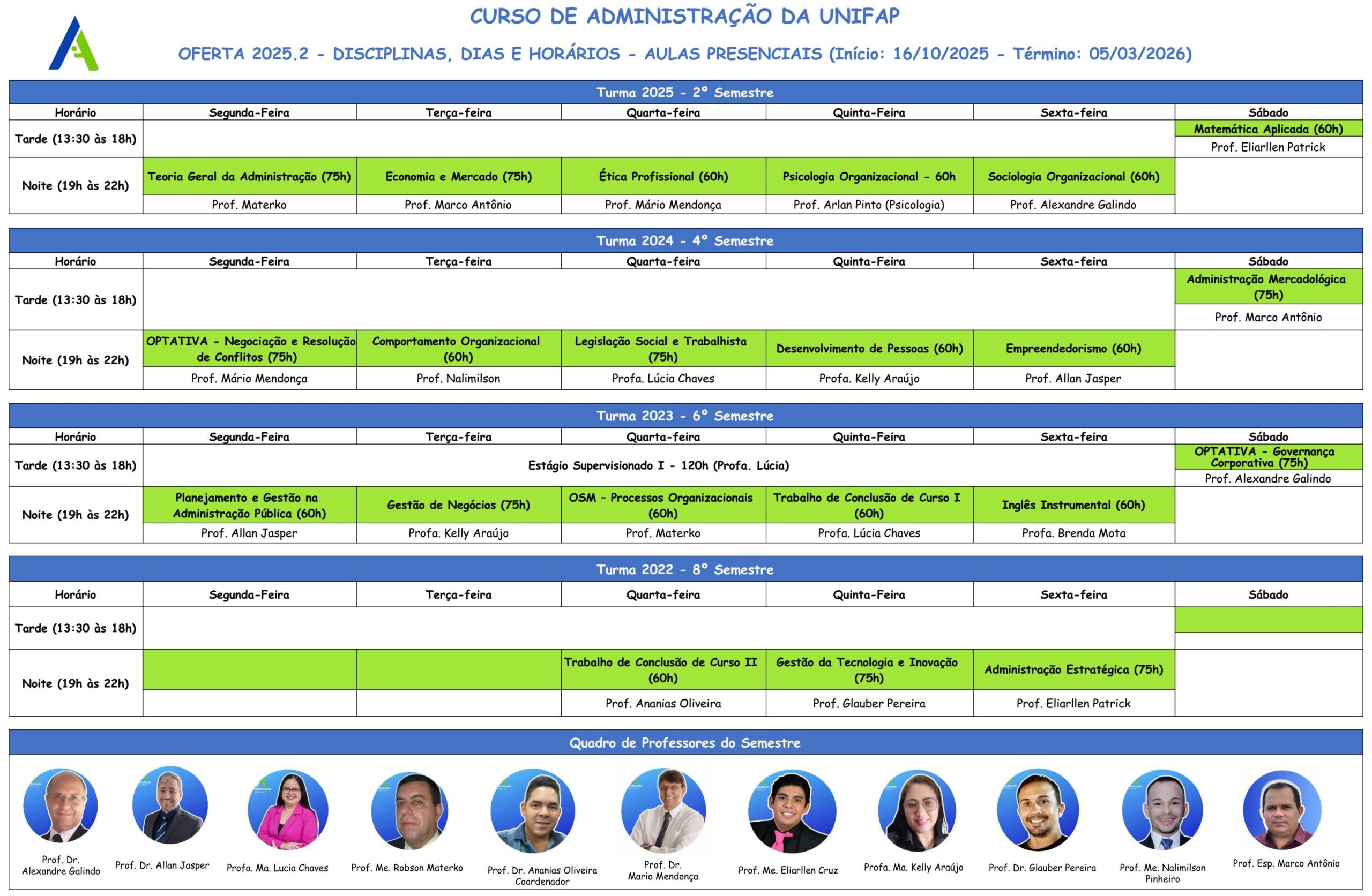 Apresentamos abaixo o Mapa de Ofertas de Disciplinas do Curso de Bacharelado em Administração da UNIFAP, para serem ministradas no período de 16/10/2025 a 05/03/2026referente ao 2º semestre de 2025. Cabe relatar que a previsão da oferta das disciplinas foi aprovada em reunião ordinária do Colegiado do Curso de Administração da UNIFAP.