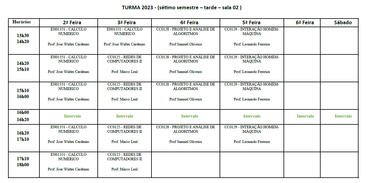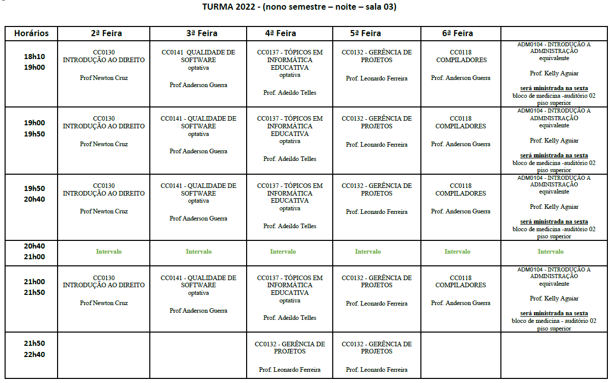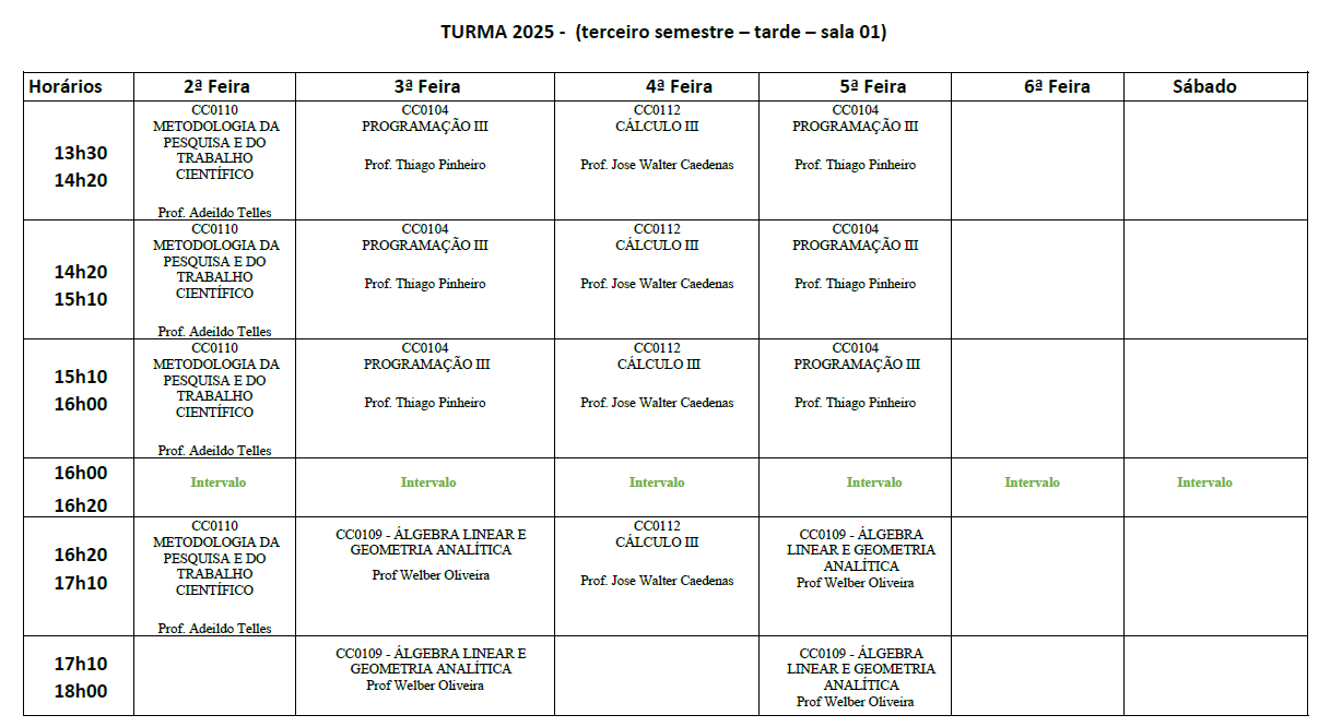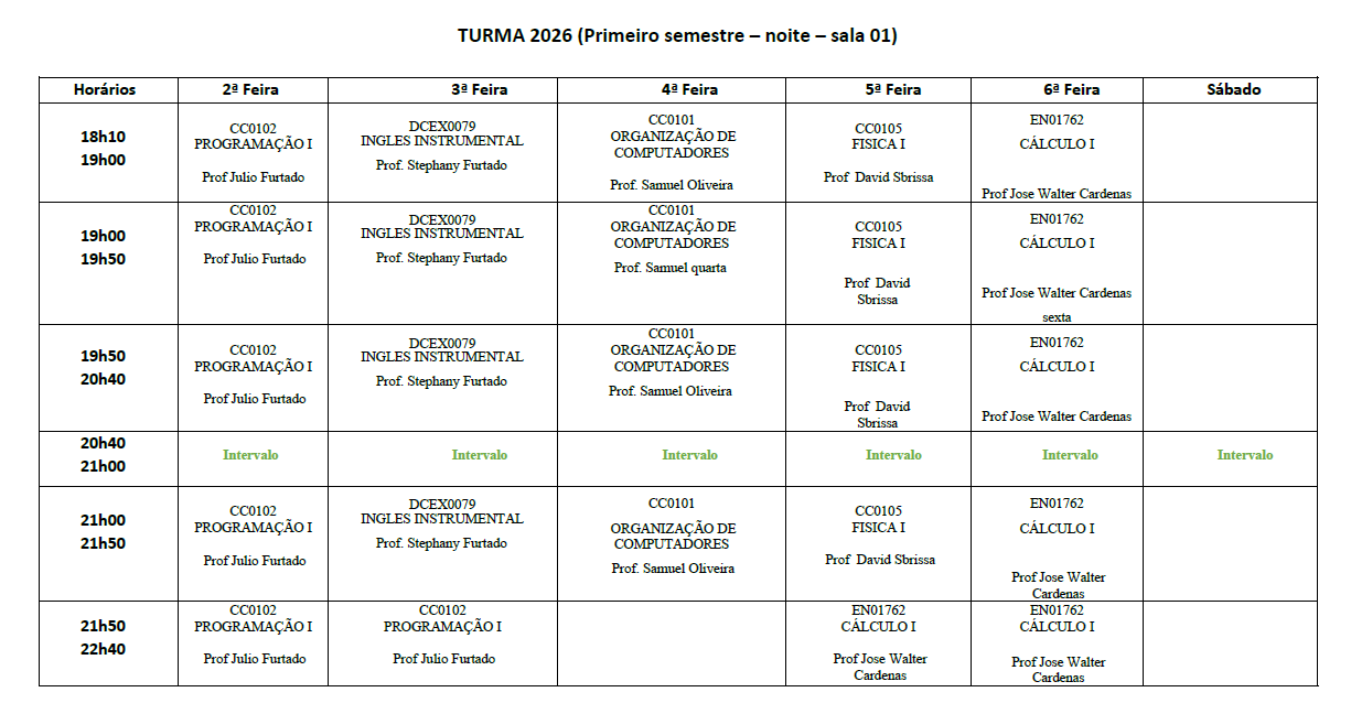 HORÁRIOS 2026.1 Baixar Horários 2026.1 Baixar Calendário Acadêmico 2026. TURMA 2026 - Sala 01 TURMA 2025 - Sala 01 TURMA 2024 - Sala 02 TURMA 2023 - Sala 02 TURMA 2022 - Sala 03 Horários anterioresClique aqui para baixar o pdf com os horários do semestre 2023.1.Clique aqui para baixar o pdf com os horários do semestre 2022.2.Clique aqui para baixar o pdf com os horários do semestre 2022.1