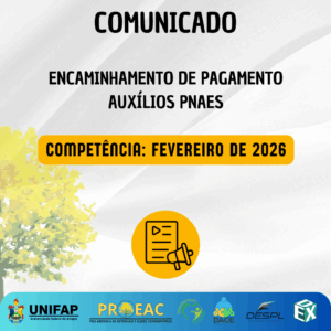 A Pró-Reitoria de Extensão e Ações Comunitárias (PROEAC), por meio do Departamento de Ações Comunitárias e Estudantis (DACE), comunica que o pagamento dos auxílios do Programa Nacional de Assistência Estudantil (PNAES), referente ao mês de fevereiro de 2026, foi encaminhado para pagamento no dia 04 de fevereiro de 2026.