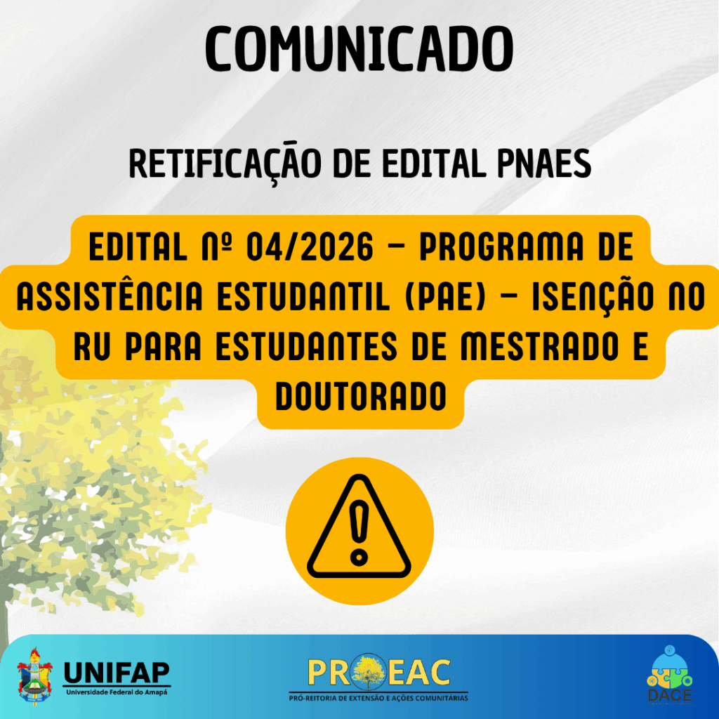 PROEAC publica retificação do Edital nº 04/2026 do Programa de Assistência Estudantil para pós-graduação A Fundação Universidade Federal do Amapá…