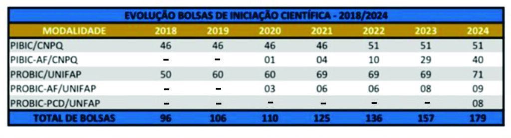 Importa ressaltar que, mesmo diante de um cenário nacional de instabilidade econômica e contingenciamentos orçamentários sucessivos, a UNIFAP tem conseguido manter, e em alguns casos expandir, sua capacidade de fomento à iniciação científica e tecnológica. Isso se deve a uma gestão comprometida com a interiorização e a inclusão, que prioriza estudantes da primeira geração universitária, povos indígenas, comunidades quilombolas, populações ribeirinhas e oriundos de contextos de vulnerabilidade social, garantindo o acesso à ciência como direito e estratégia de emancipação.