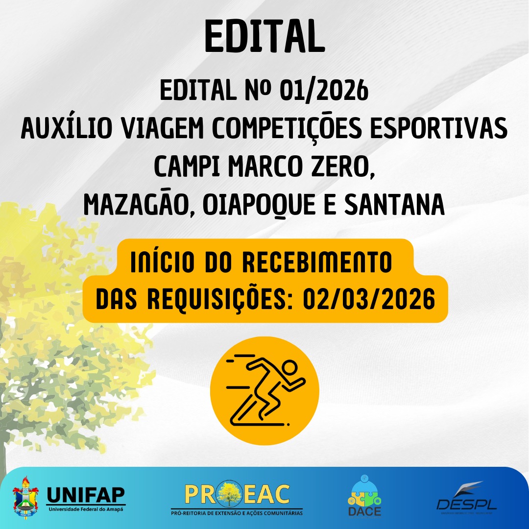 A Pró-Reitoria de Extensão e Ações Comunitárias (PROEAC), por meio do DACE e da Divisão de Esporte e Lazer (DESPL), informa que está publicado o Edital nº 01/2026 – Auxílio Viagem para Eventos Esportivos da Universidade Federal do Amapá (UNIFAP).