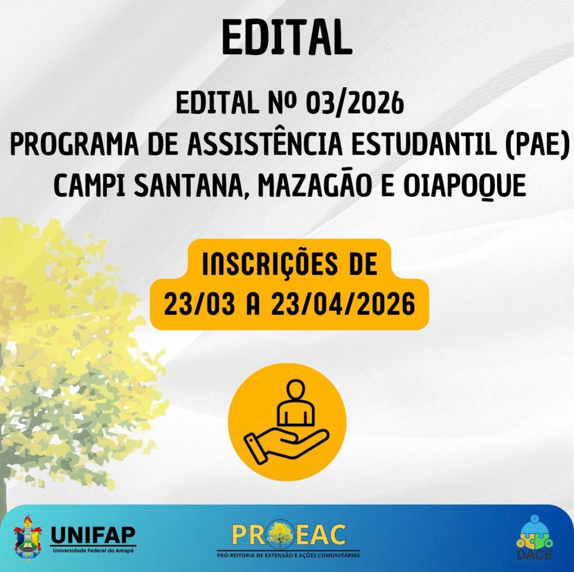 0 EDITAL Nº 03/2026 – PROGRAMA DE ASSISTÊNCIA ESTUDANTIL (PAE) Posted on 30 de abril de 2026 by darlihanne https://www2.unifap.br/dace/archives/9143