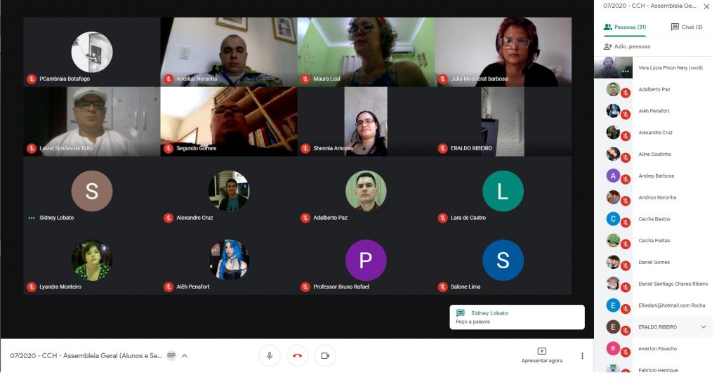 Na ocasião foi feito também o agendamento da próxima reunião em estilo Assembleia Geral (com alunos e Servidores) do Curso de graduação em história DFCH, planejada para sexta feira (09/07/2020 às 15h), com a mesma ferramenta, pela Internet.