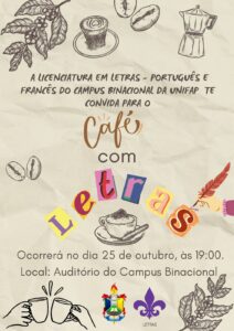 O Colegiado do Curso de Letras e o Centro Acadêmico Terezinha Maciel convidam a todos a participar da 4a. edição do Café com Letras, que acontecerá neste sábado, dia 25 de outubro, às 19h, no auditório (sala D 6). Será um momento de recepção dos novos discentes. Haverá intervenção dos estudantes, professores e egressos do curso. Teremos sarau literário e sorteio de livros . Estudante de Letras, participe!!