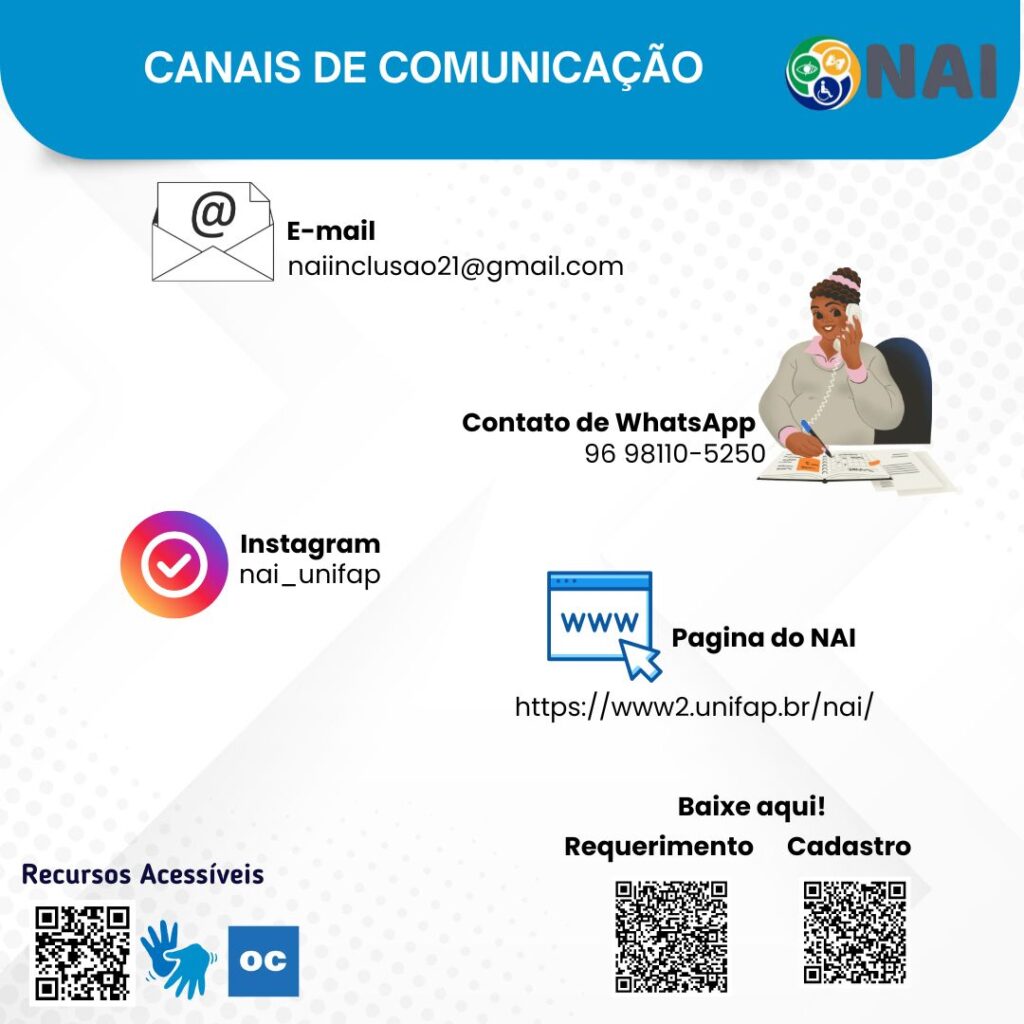 Segue O FLUXO VISUAL DE LINGUAGEM SIMPLES: CANAIS DE COMUNICAÇÃO DO NAI, com informações diversas de como se comunicar com o núcleo, para obter informações ou realizar solicitações.