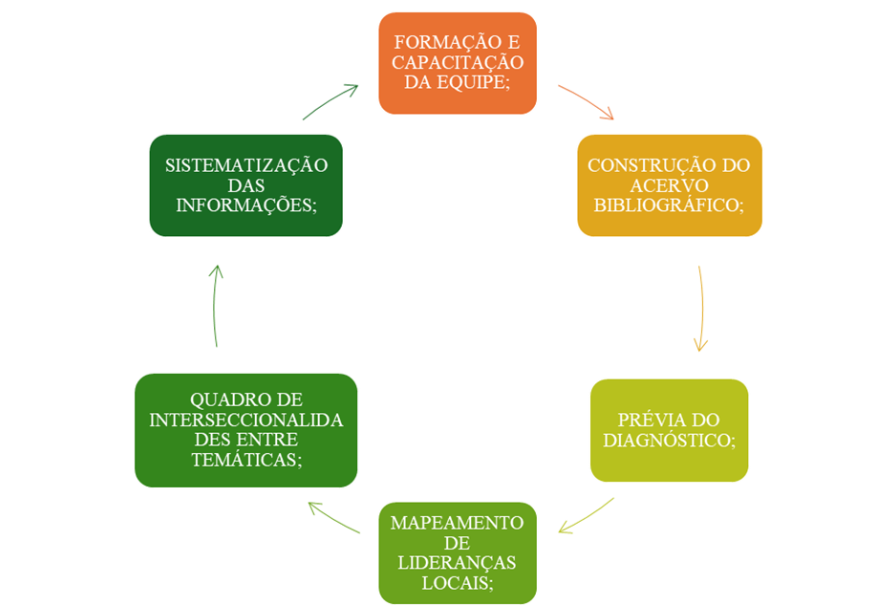A primeira etapa foi concluída com a elaboração do Relatório Preliminar de Diagnóstico e dois instrumentos estratégicos: o Mapeamento de Lideranças Locais e o Quadro de Interseccionalidades Temáticas. Este último constituiu uma ferramenta analítica fundamental para compreensão das sobreposições e inter-relações entre os diferentes eixos temáticos, orientando as ações de campo e a formulação de políticas integradas.