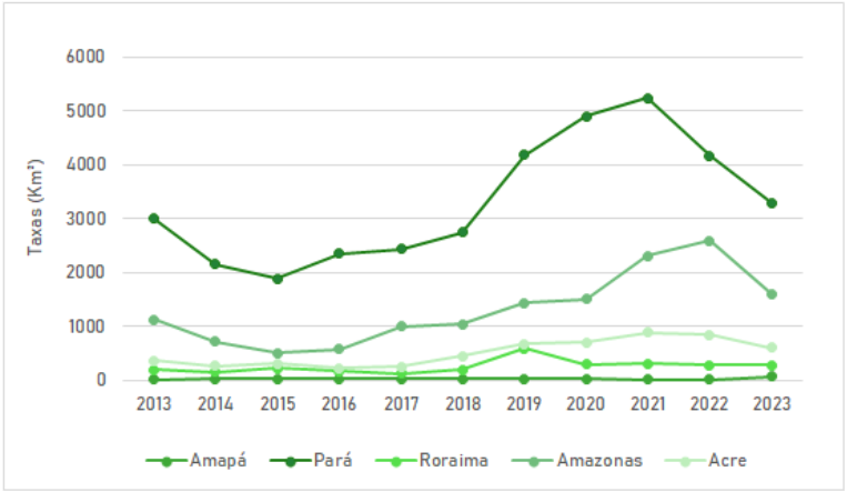 Para analisar os índices de desmatamento entre os estados que fazem parte do Arco Norte (Amapá, Amazonas, Acre, Pará e Roraima), será usado como referência o periodo entre 2013 e 2023.