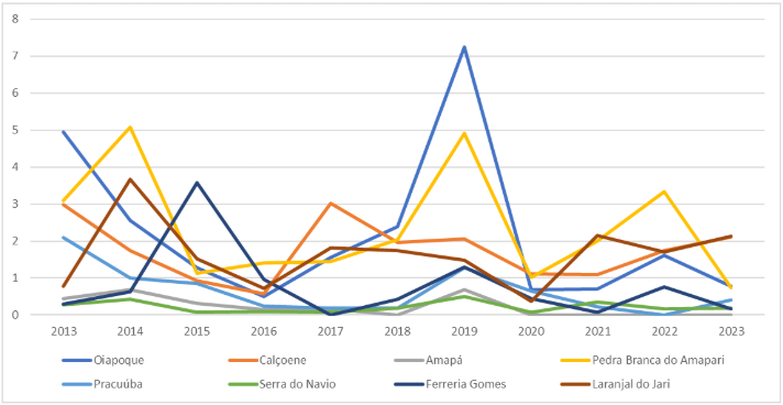 Os índices de desmatamento nos municípios da FF-AP revelam padrões distintos de variação da área desmatada. Municípios como Oiapoque e Pedra Branca do Amapari apresentam índices significativos, enquanto outros, como Serra do Navio e Amapá, mantêm áreas desmatadas relativamente baixas. Essas diferenças podem ser atribuídas a uma combinação de fatores, incluindo a eficácia das políticas de conservação, as pressões socioeconômicas locais e as práticas de uso da terra.