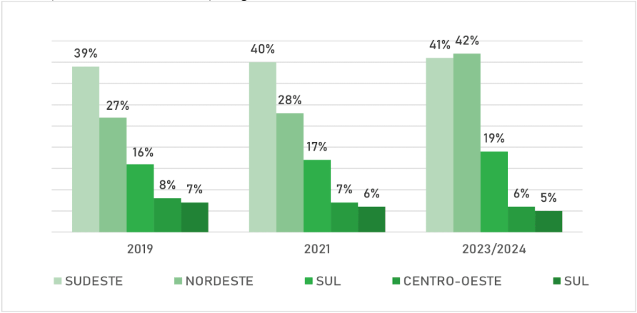 Partindo para o panorama dos turistas nacionais, em 2019 e 2021, o Boletim do Turismo Doméstico Brasileiro, feito pelo Instituto Brasileiro de Geografia e Estatística (IBGE), em parceria com o MTur, realizou o ranking das regiões com maiores e menores receptores e emissores de turistas, e ao comparar com um contexto mais recente, o estudo de Tendências de Turismo de 2023 publicado em 2024, revela dados diferentes dos anos anteriores (gráfico 18).