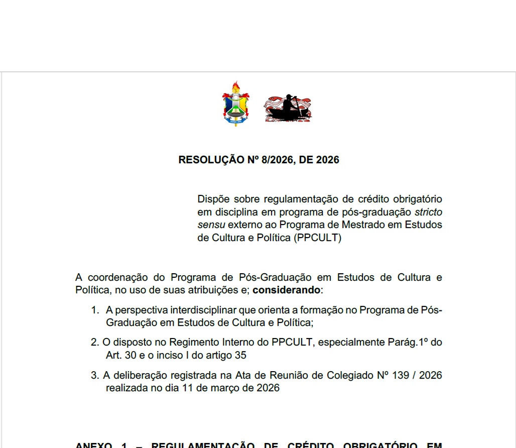 Dispõe sobre regulamentação de crédito obrigatório em disciplina em programa de pós-graduação stricto sensu externo ao Programa de Mestrado em Estudos de Cultura e Política (PPCULT)