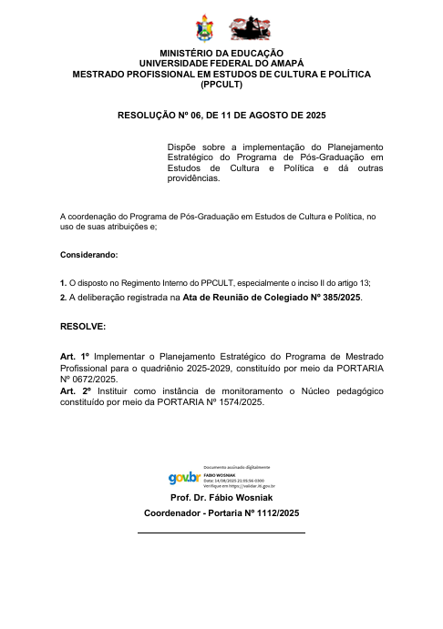 Dispõe sobre a implementação do Planejamento Estratégico do Programa de Pós-Graduação em Estudos de Cultura e Política e dá outras providências
