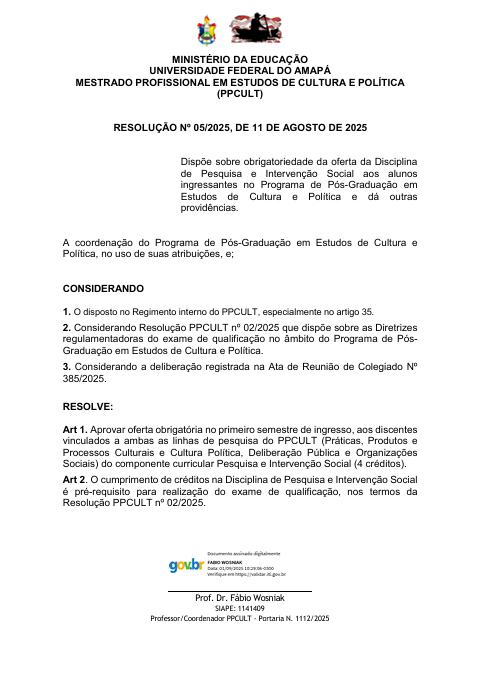 Dispõe sobre obrigatoriedade da oferta da Disciplina de Pesquisa e Intervenção Social aos alunos ingressantes no Programa de Pós-Graduação em Estudos de Cultura e Política e dá outras providências