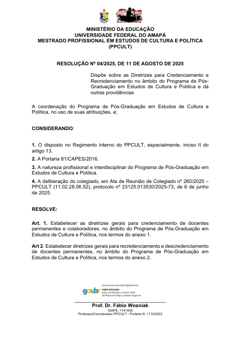 Dispõe sobre as Diretrizes para Credenciamento e Recredenciamento no âmbito do Programa de Pós-Graduação em Estudos de Cultura e Política