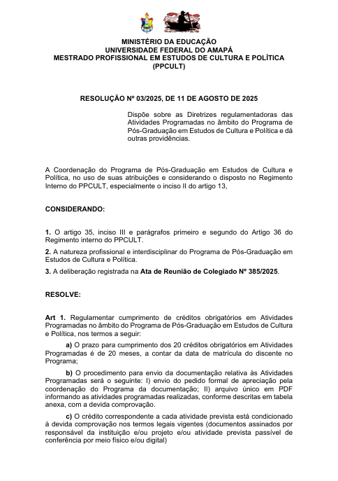 Dispõe sobre as Diretrizes regulamentadoras das Atividades Programadas no âmbito do Programa de Pós-Graduação em Estudos de Cultura e Política