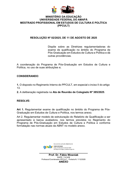 Dispõe sobre as Diretrizes regulamentadoras do exame de qualificação no âmbito do Programa de Pós-Graduação em Estudos de Cultura e Política