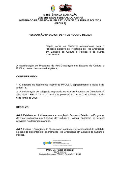 Dispõe sobre as Diretrizes orientadoras para o Processo Seletivo do Programa de Pós-Graduação em Estudos de Cultura e Política