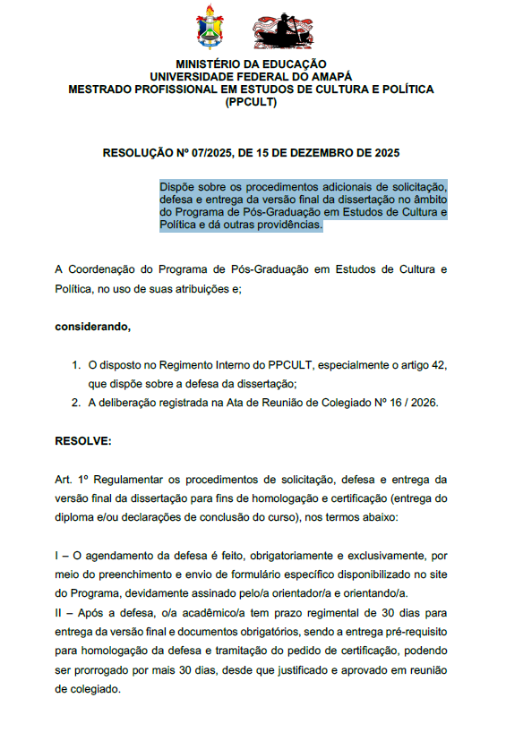 Dispõe sobre os procedimentos adicionais de solicitação, defesa e entrega da versão final da dissertação no âmbito do Programa de Pós-Graduação em Estudos de Cultura e Política e dá outras providências.
