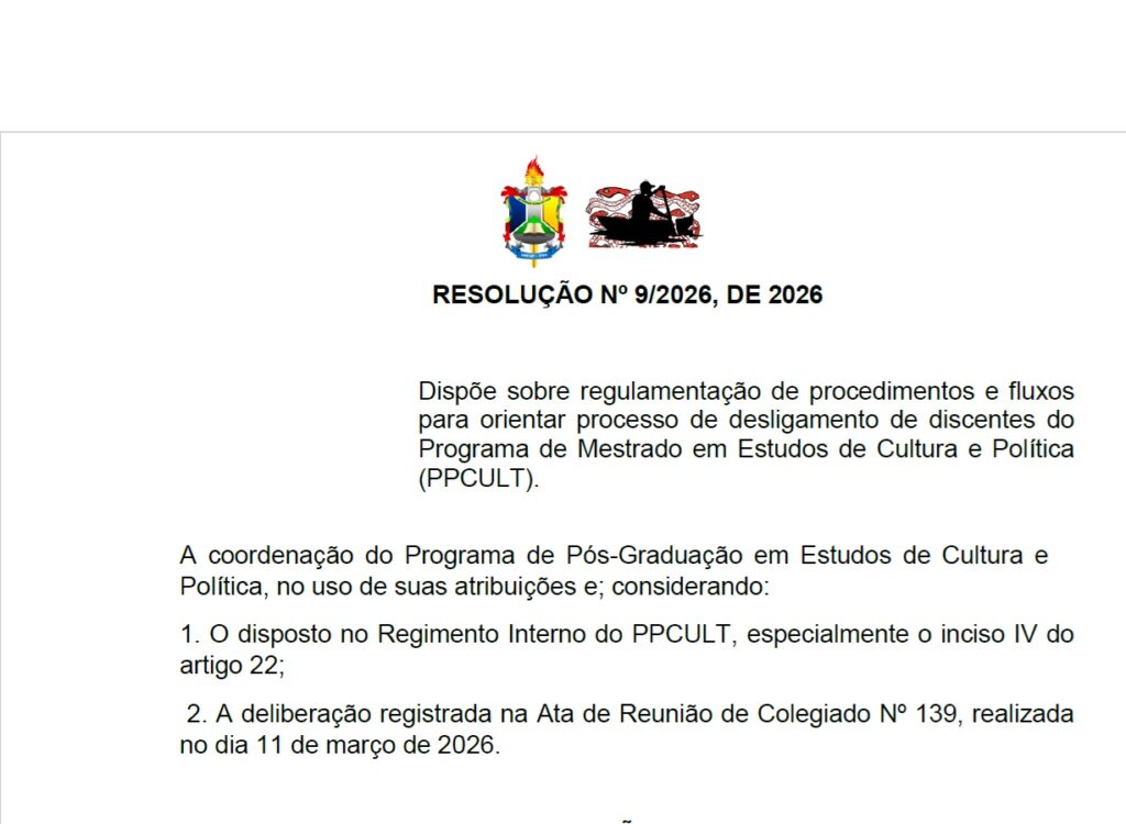 Dispõe sobre regulamentação de procedimentos e fluxos para orientar processo de desligamento de discentes do Programa de Mestrado em Estudos de Cultura e Política (PPCULT).