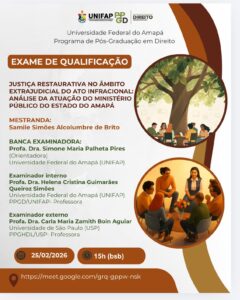 É com grande satisfação que convidamos a comunidade acadêmica e o público interessado para a banca de qualificação da mestranda Samile Simões Alcolumbre de Brito, com a pesquisa jurídica intitulada: