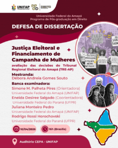 É com grande satisfação que o Programa de Pós-Graduação em Direito da Universidade Federal do Amapá convida toda a comunidade acadêmica para a defesa de dissertação da mestranda Débora Andreia Gomes Souto.