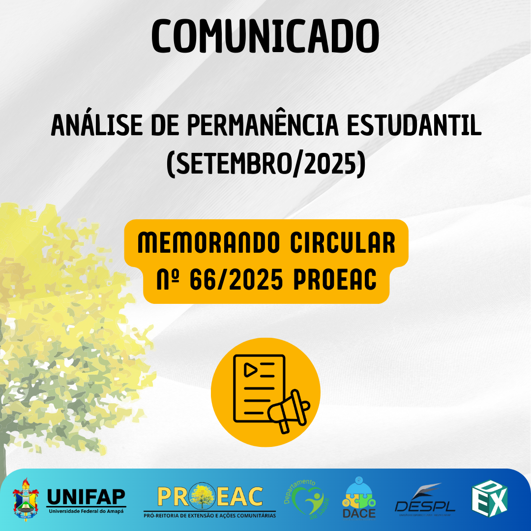 A Pró-Reitoria de Extensão e Ações Comunitárias (PROEAC), por meio do Departamento de Assistência e Acompanhamento ao Estudante (DACE), informa que, no mês de setembro de 2025, será realizada a Análise de Permanência da situação acadêmica dos(as) estudantes que ingressaram antes do semestre 2024.2.