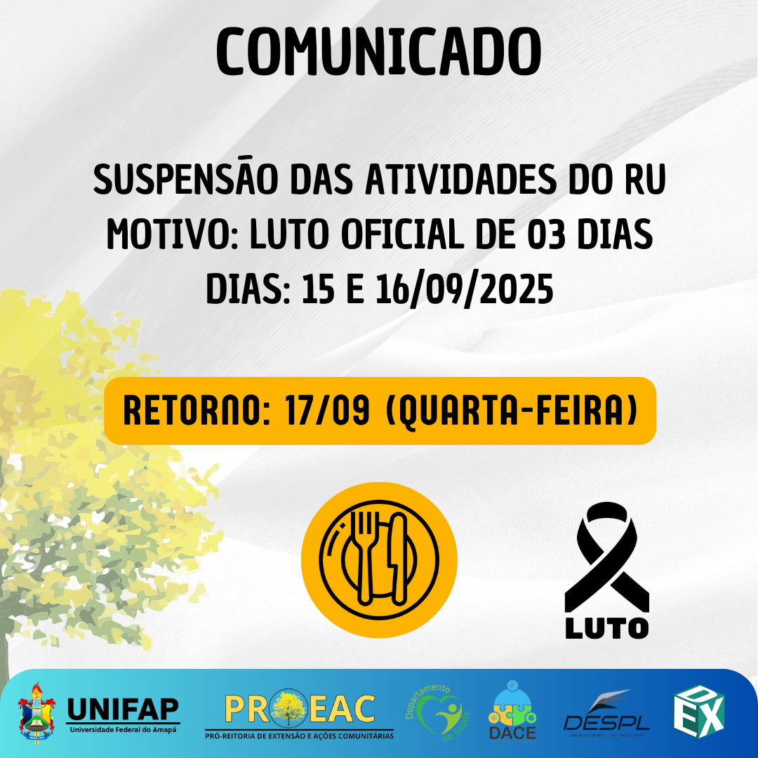 A Pró-Reitoria de Extensão e Ações Comunitárias (PROEAC) e a Diretoria de Assistência e Cultura Estudantil (DACE) informam que, em razão do luto oficial de três dias decretado pela Reitoria da Universidade Federal do Amapá, o Restaurante Universitário (RU) não funcionará nos dias 15 e 16 de setembro de 2025.