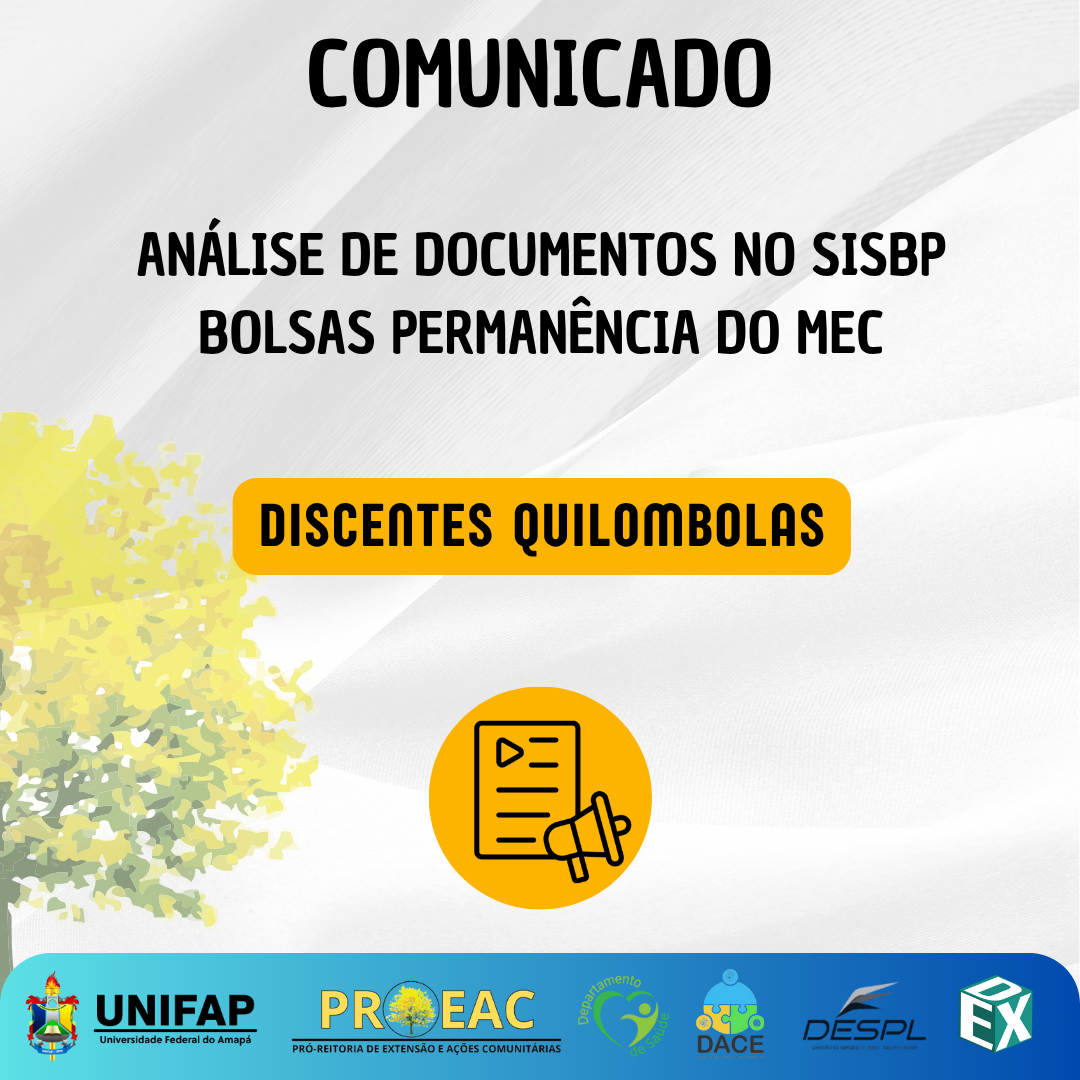 A Pró-Reitoria de Extensão e Ações Comunitárias (PROEAC), por meio do Departamento de Ações Comunitárias e Estudantis (DACE), informa que, na próxima semana, será realizada a análise dos documentos encaminhados pelos(as) estudantes regularmente matriculados(as) nos cursos presenciais da UNIFAP, que efetuaram cadastro no Sistema SISBP.
