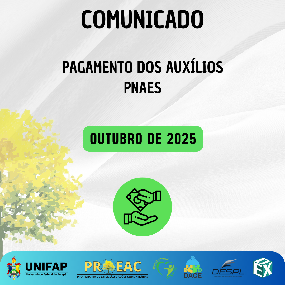 A Pró-Reitoria de Extensão e Ações Comunitárias (PROEAC) informa que foi realizado o envio do pagamento dos auxílios do Programa Nacional de Assistência Estudantil (PNAES), referente ao mês de outubro de 2025, conforme Processo Eletrônico nº 23125.023344/2025-42, cadastrado em 07 de outubro de 2025.