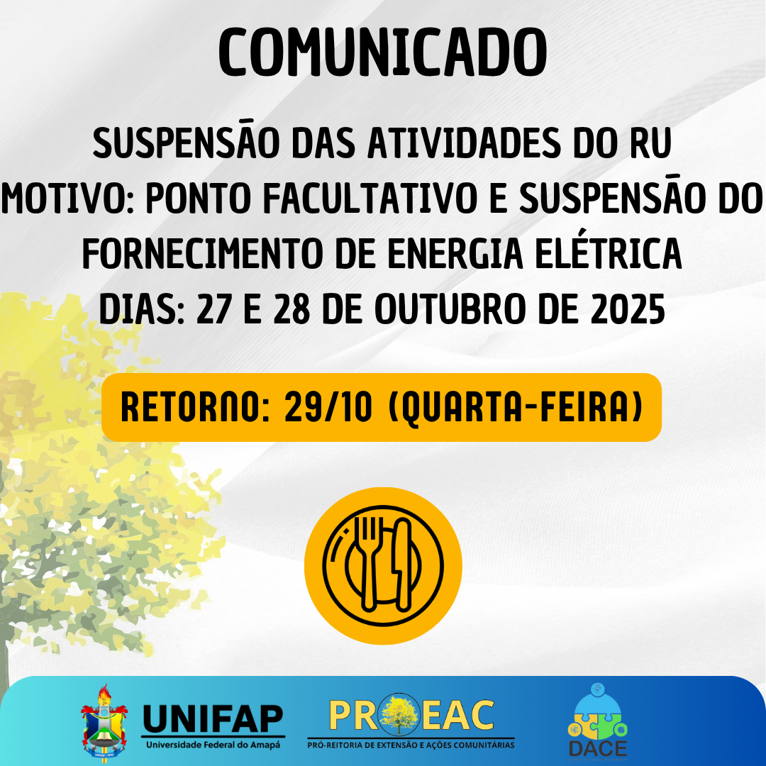 A Universidade Federal do Amapá (UNIFAP) informa à comunidade acadêmica que o Restaurante Universitário (RU) não funcionará nos dias 27 e 28 de outubro de 2025, em razão do ponto facultativo e da interrupção no fornecimento de energia elétrica no Campus Marco Zero.