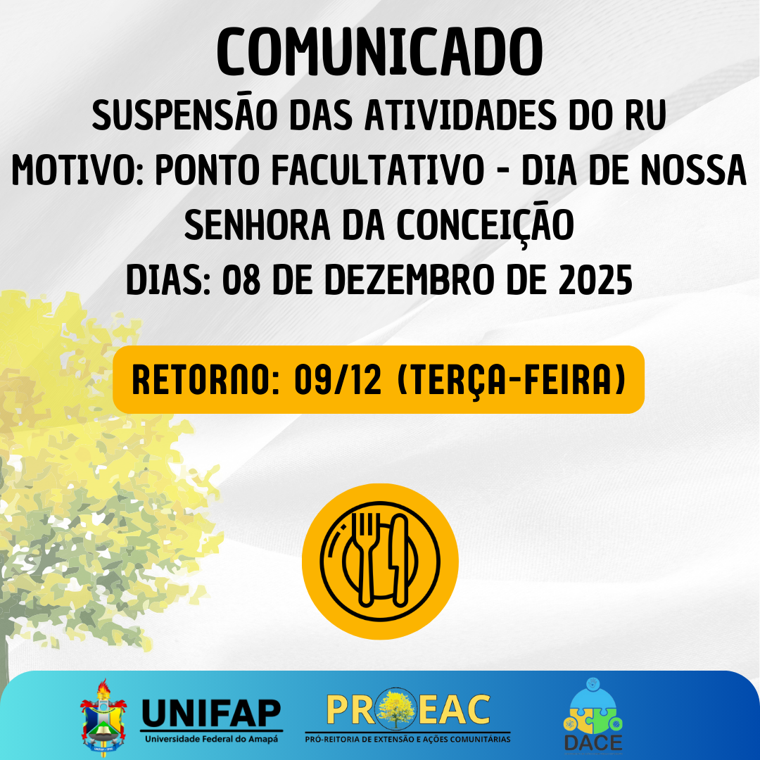 A Universidade Federal do Amapá (UNIFAP) informa que as atividades do Restaurante Universitário (RU) estarão suspensas no dia 08 de dezembro de 2025 (segunda-feira), em virtude do Ponto Facultativo declarado pela Administração Superior no Memorando Circular nº 49/2025 – PROGEP, referente às comemorações do Dia de Nossa Senhora da Conceição, conforme previsto no Calendário Acadêmico vigente.