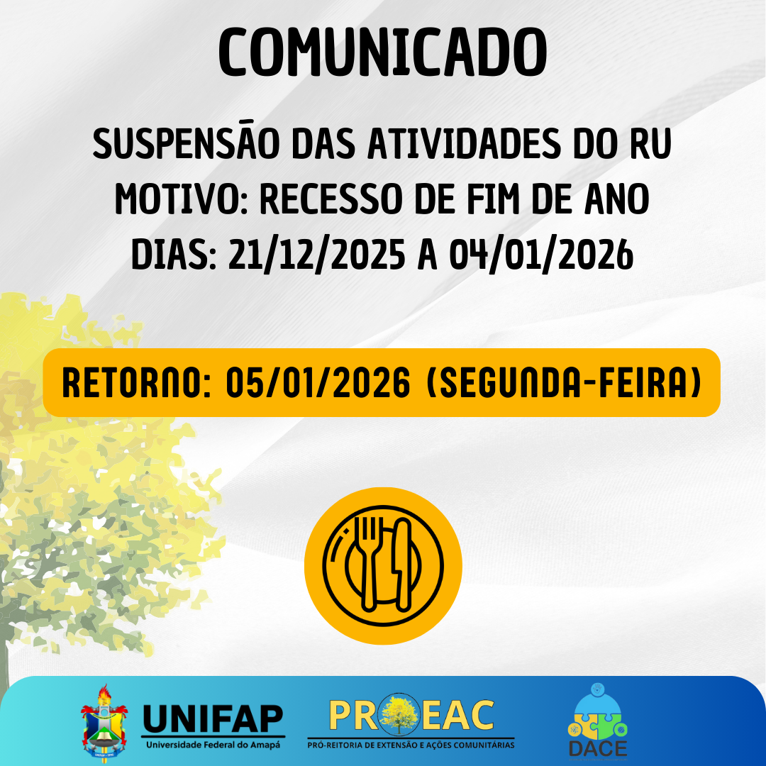 A interrupção ocorre em razão do recesso de fim de ano e da necessidade de realização de reparos na unidade, conforme solicitação formal da empresa C.Q. Comércio e Serviços Alimentícios e Eventos Ltda., responsável pela operação do RU, por meio do Ofício nº 53/2025, no âmbito do Contrato nº 021/2022 – RU/UNIFAP.