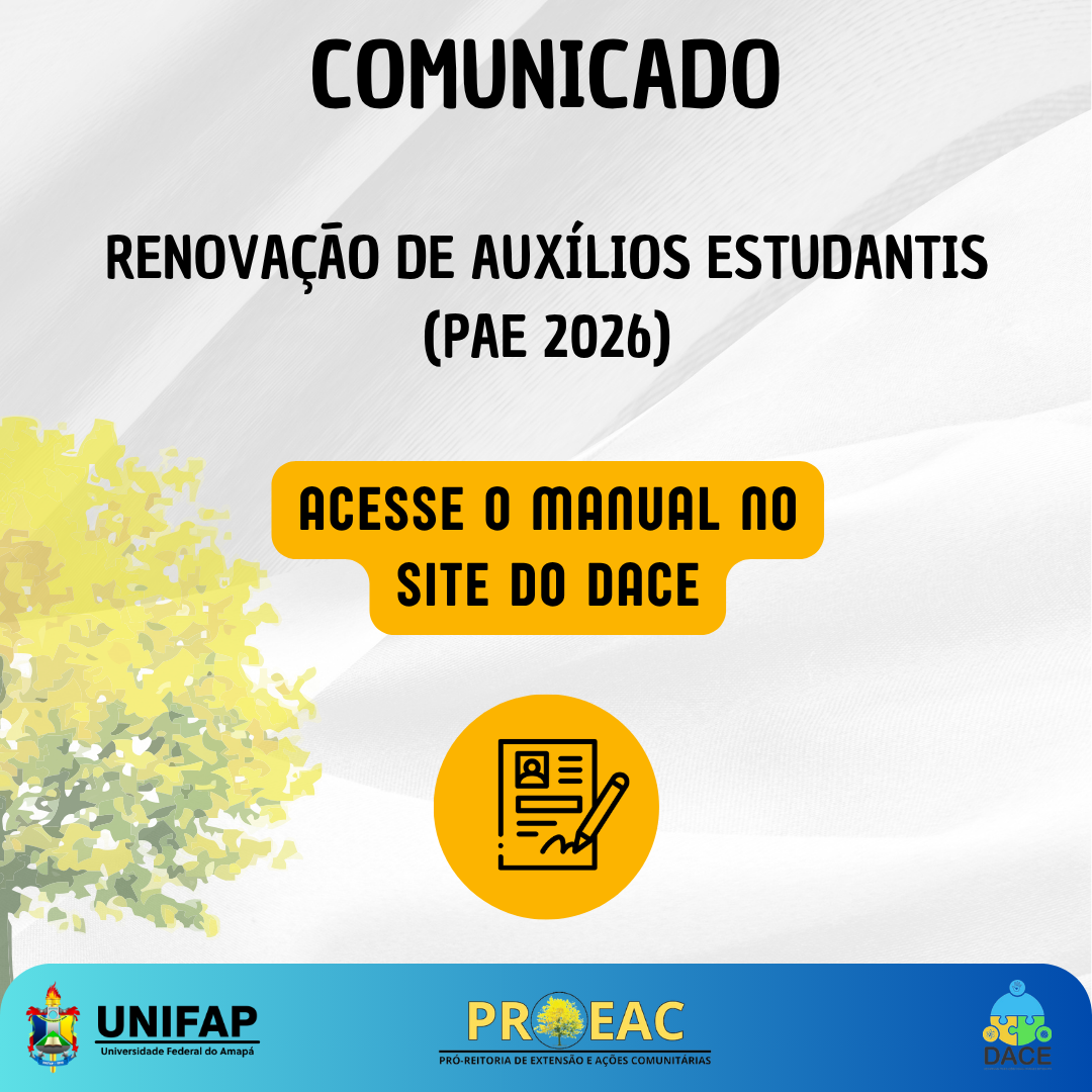 A Fundação Universidade Federal do Amapá (UNIFAP), por meio da Pró-Reitoria de Extensão e Ações Comunitárias (PROEAC) e do Departamento de Ações Comunitárias e Estudantis (DACE), informa aos discentes que já possuem auxílio estudantil vigente que, para continuar recebendo os benefícios no ano de 2026, será necessário realizar a adesão ao novo Cadastro Único no SIGAA.