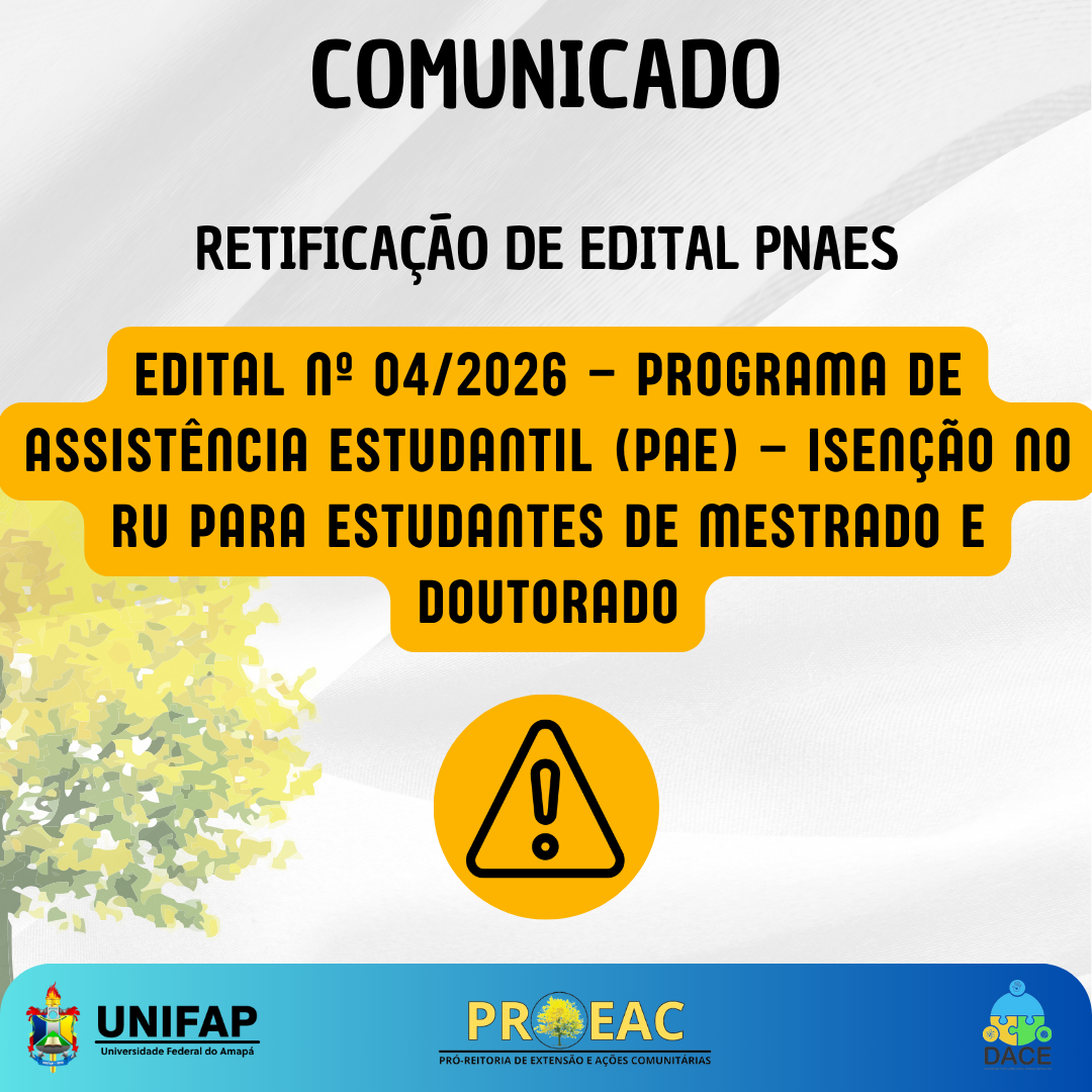 A Fundação Universidade Federal do Amapá (UNIFAP), por meio da Pró-Reitoria de Extensão e Ações Comunitárias (PROEAC) e do Departamento de Ações Comunitárias e Estudantis (DACE), publicou a Retificação nº 01 do Edital nº 04/2026, referente ao Programa de Assistência Estudantil (PAE) destinado a estudantes de mestrado e doutorado, com concessão de isenção no Restaurante Universitário (RU).