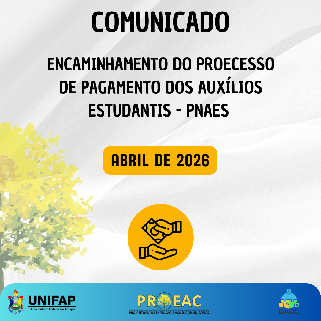 O Departamento de Ações Comunitárias e Estudantis da Universidade Federal do Amapá, vinculado à Pró-Reitoria de Extensão e Ações Comunitárias, informa à comunidade acadêmica que o processo nº 23125.006886/2026-31, referente ao pagamento dos auxílios do Programa Nacional de Assistência Estudantil (PNAES), correspondente ao mês de abril de 2026, foi devidamente cadastrado no sistema no dia 04 de abril de 2026.