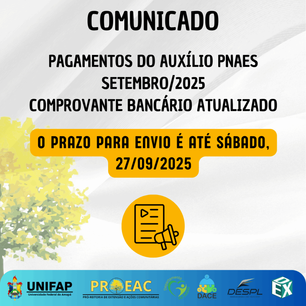 Comunicado – Pagamentos do Auxílio PNAES referente ao mês de setembro de 2025 Comunicado / 23 de setembro de 2025 Comunicado – Pagamentos do Auxílio PNAES referente ao mês de setembro de 2025 Read More »