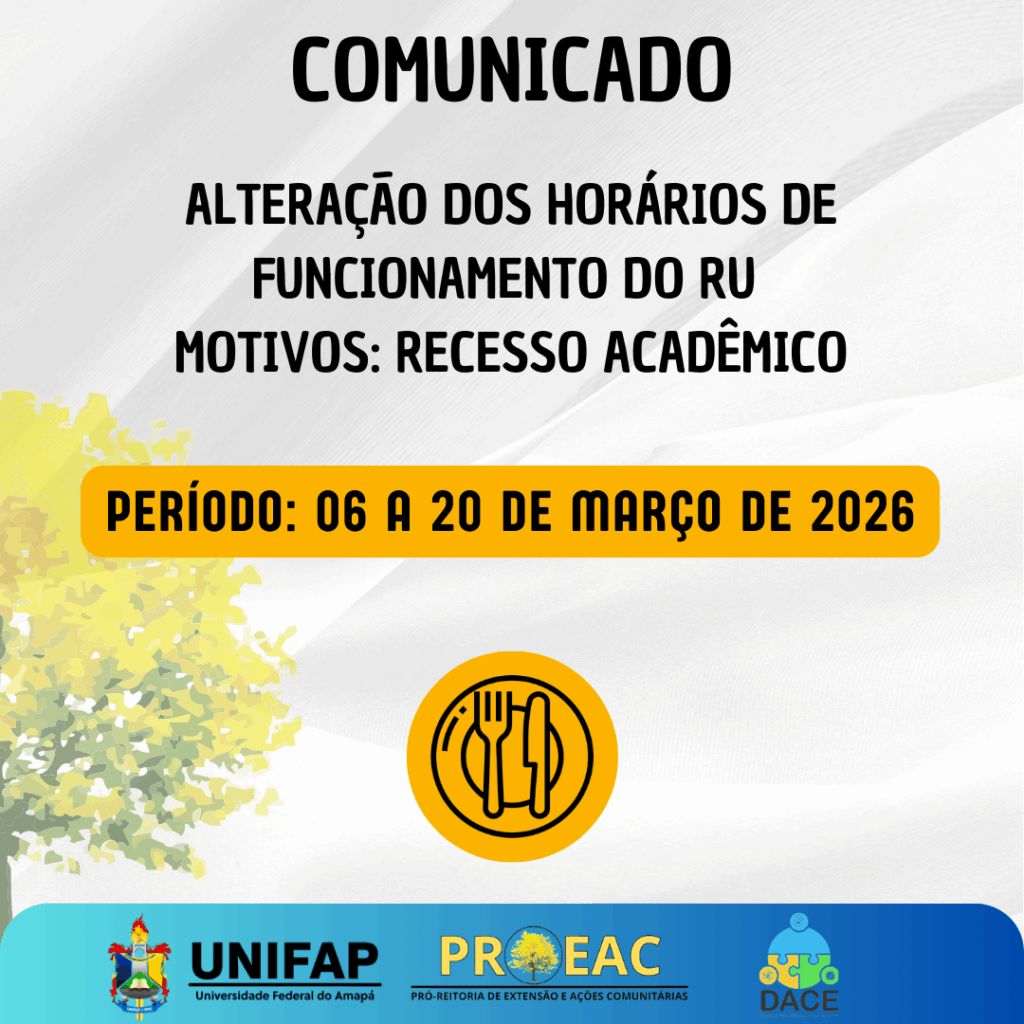 Funcionamento do Restaurante Universitário no Recesso Acadêmico – Março/2026 Comunicado / 27 de fevereiro de 2026 / #ComunicadoRU Funcionamento do Restaurante Universitário no Recesso Acadêmico – Março/2026 Read More »