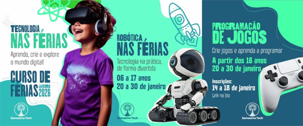 O Programa Samaúma Tech apresenta o Curso Robótica nas Férias 2026, voltado para crianças de 6 a 11 anos e adolescentes de 12 a 17 anos interessados no universo da tecnologia e inovação! 🤖✨